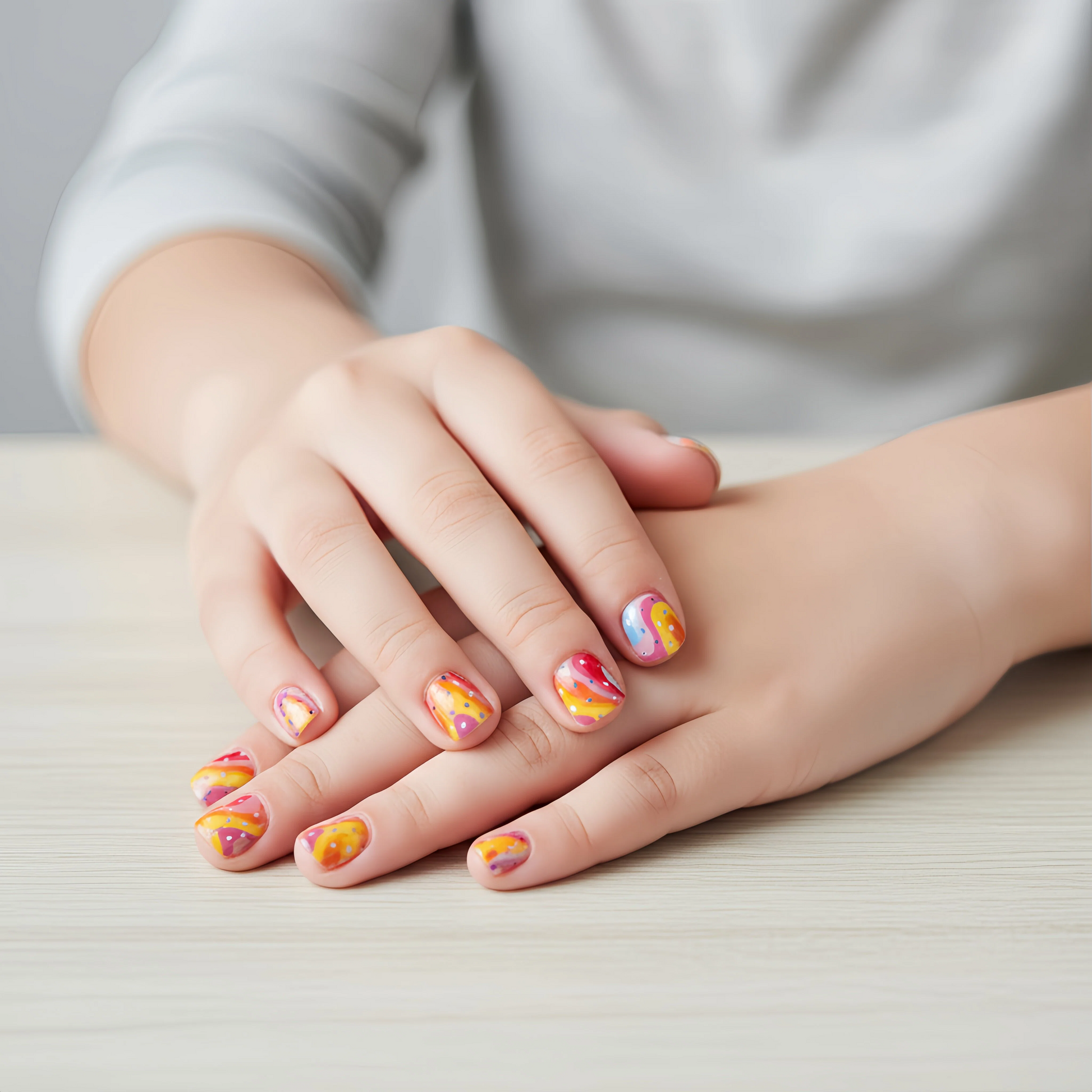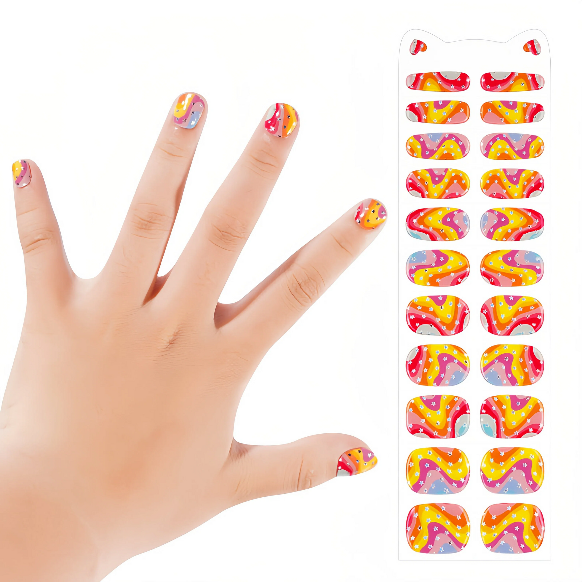 Design: Get ready for a party! Bright pink, sunny yellow, and sky blue twist together in a fun, groovy swirl. Some nails are sprinkled with tiny stars for extra dazzle!